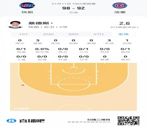 快船次轮50号秀科比·桑德斯 登场10.2分钟